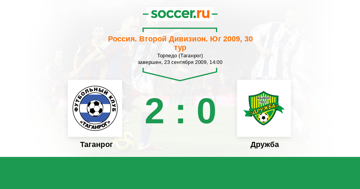 Россия. Вторая лига. Группа 1 06.06.2009 Дружба Логотип футбольный клуб Дружба (Майкоп) 3:0 Логотип футбольный клуб Таганрог Таганрог