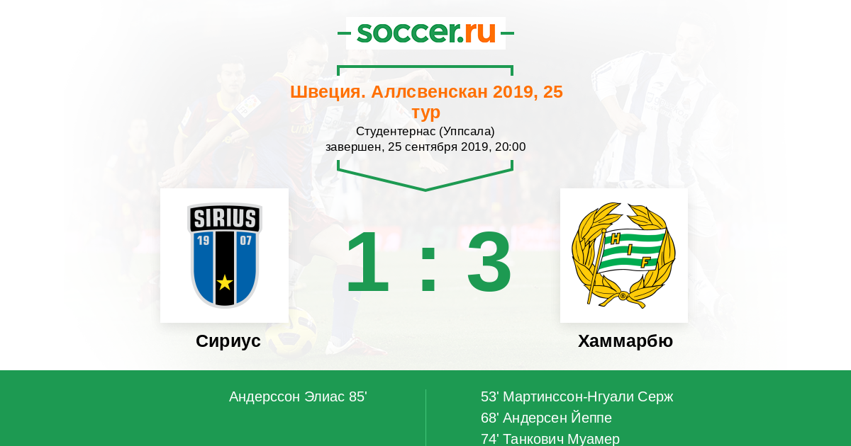 Швеция. Аллсвенскан 22.08.2020 Сириус Логотип футбольный клуб Сириус (Уппсала) 3:1 Логотип футбольный клуб Хаммарбю (Стокгольм) Хаммарбю