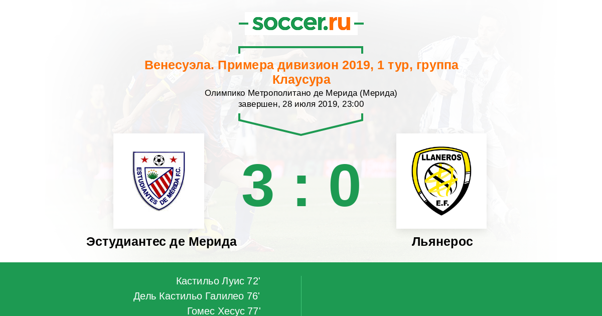 Венесуэла. Примера дивизион 20.09.2015 Льянерос Логотип Льянерос (Гуанаре) 2:1 Логотип футбольный клуб Эстудиантес Мерида Эстудиантес Мерида