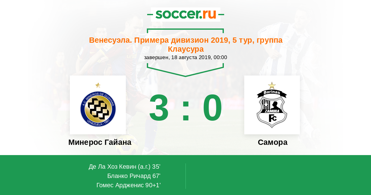 Венесуэла. Примера дивизион 20.09.2018 Минерос Гайана Логотип футбольный клуб Минерос Гайана 2:2 Логотип футбольный клуб Замора (Баринас) Замора