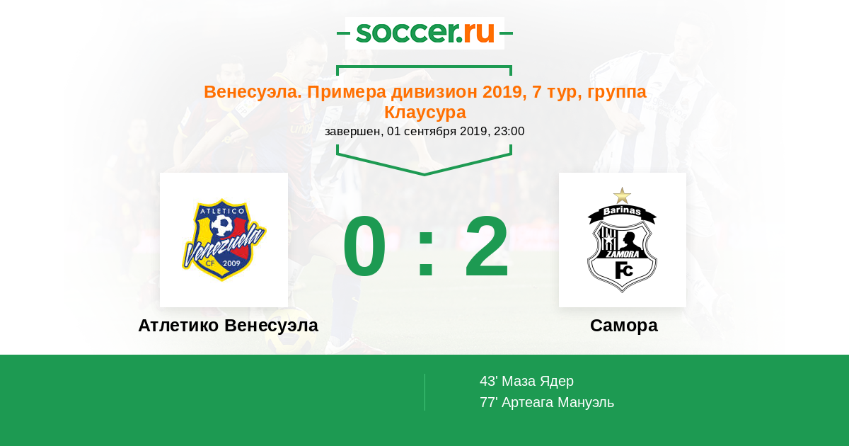 Венесуэла. Примера дивизион 05.04.2017 Замора Логотип футбольный клуб Замора (Баринас) 4:0 Логотип Атлетико Венесуэла (Майкуетья) Атлетико Венесуэла