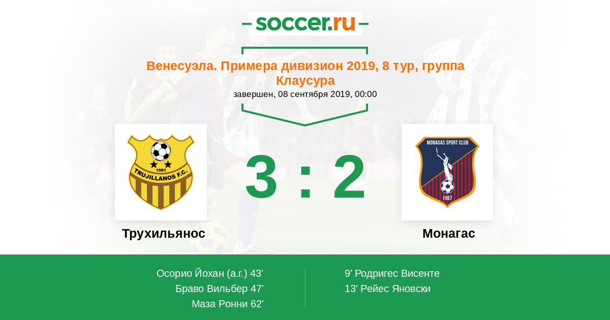Венесуэла. Примера дивизион 02.09.2018 Монагас Логотип футбольный клуб Монагас (Матурин) 1:1 Логотип футбольный клуб Трухильянос (Валера) Трухильянос