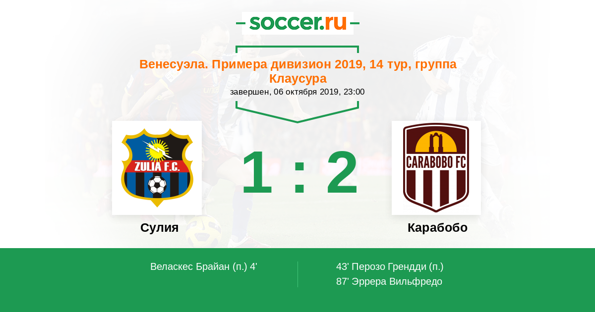 Венесуэла. Примера дивизион 05.10.2014 Карабобо Логотип футбольный клуб Карабобо (Валенсия) 1:1 Логотип футбольный клуб Сулия (Маракайбо) Сулия