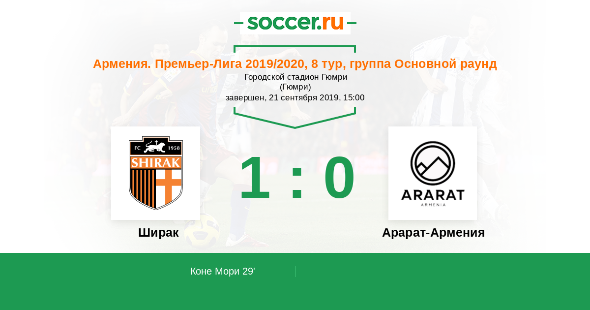 Армения. Премьер-лига 20.06.2020 Ширак Логотип футбольный клуб Ширак (Гюмри) 1:0 Логотип футбольный клуб Арарат-Армения (Ереван) Арарат-Армения