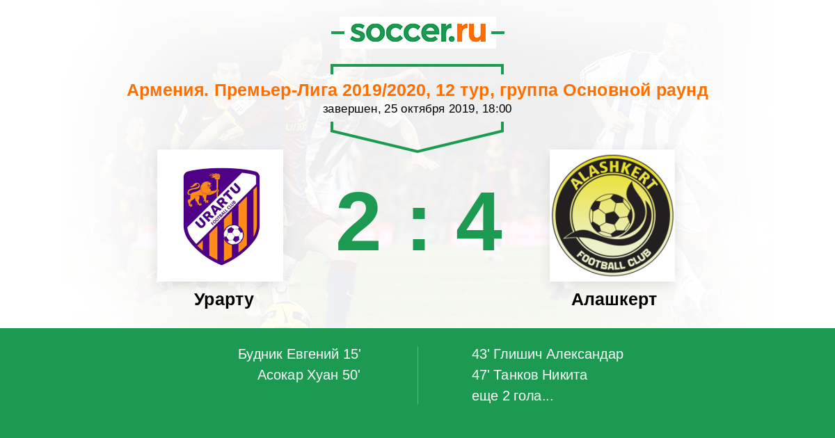 Армения. Премьер-лига 17.08.2019 Алашкерт Логотип футбольный клуб Алашкерт (Мартуни) 2:1 Логотип футбольный клуб Урарту (Ереван) Урарту