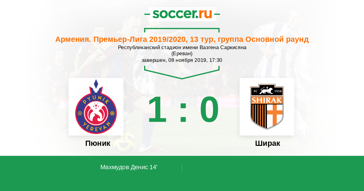 Армения. Премьер-лига 24.11.2013 Пюник Логотип футбольный клуб Пюник (Ереван) 1:2 Логотип футбольный клуб Ширак (Гюмри) Ширак
