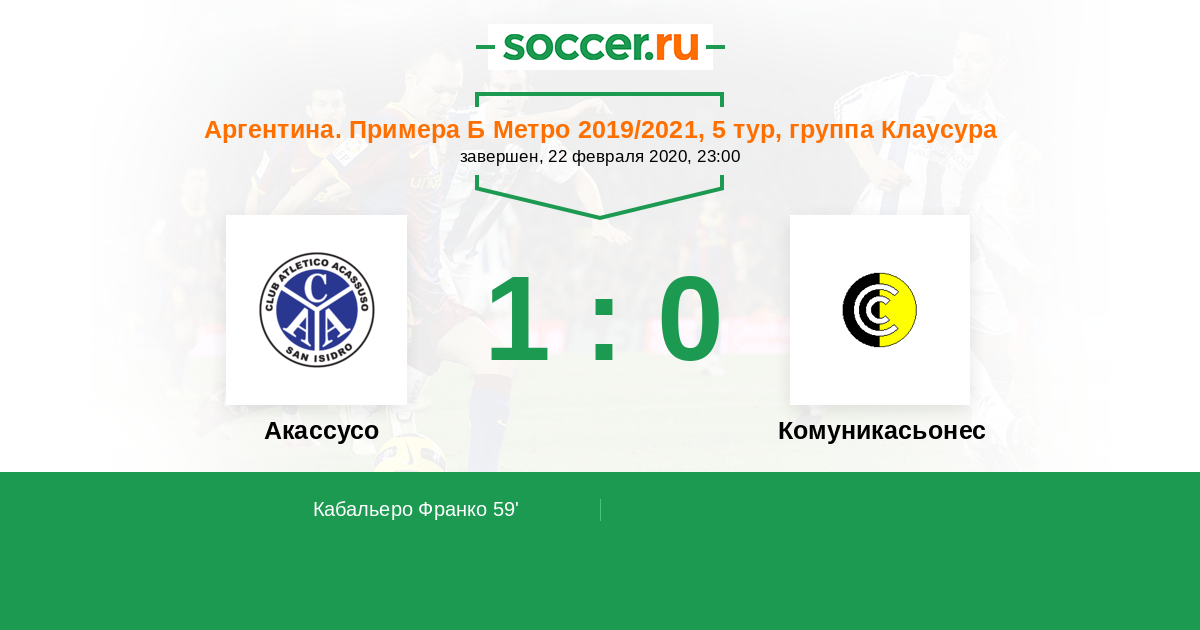 Аргентина. Примера Б Метро 02.02.2019 Акассусо Логотип футбольный клуб Акассусо (Сан-Исидро) 2:0 Логотип футбольный клуб Комуникасьонес (Буэнос-Айрес) Комуникасьонес