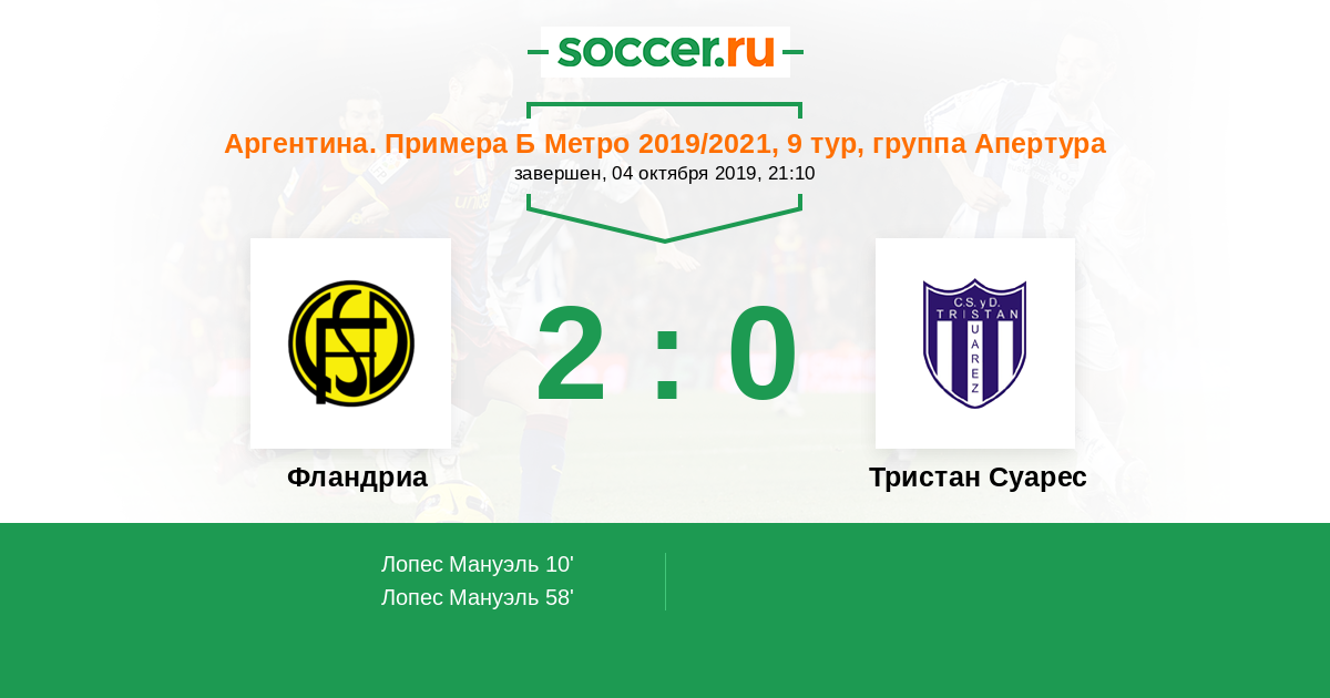 Аргентина. Примера Б Метро 19.10.2013 Фландриа Логотип футбольный клуб Фландриа (Лухан) 2:0 Логотип футбольный клуб Тристан Суарес (Эсейса) Тристан Суарес