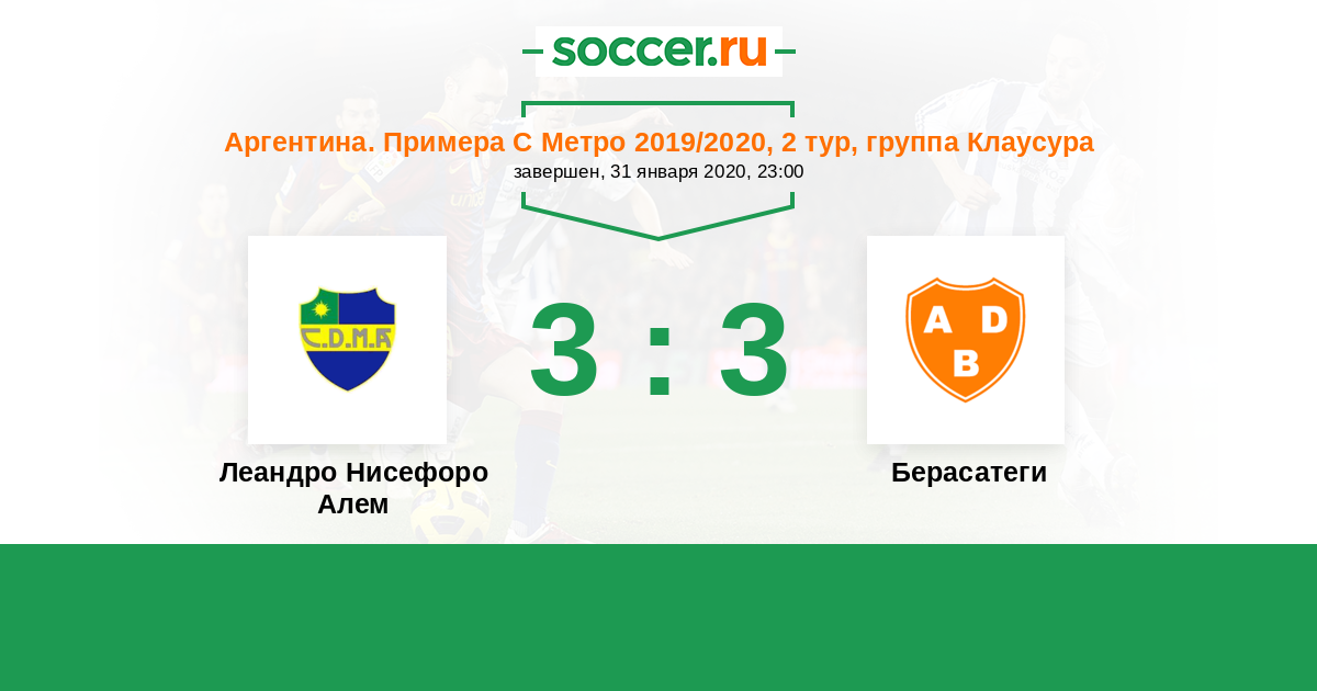 Аргентина. Примера С Метро 04.03.2019 Леандро Нисефоро Алем Логотип футбольный клуб Леандро Нисефоро Алем (Буэнос-Айрес) 0:1 Логотип футбольный клуб Берасатеги (Буэнос-Айрес) Берасатеги