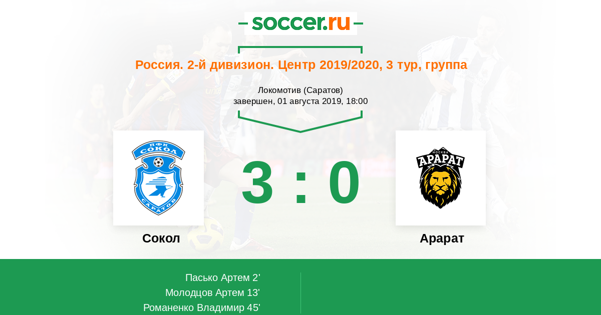 Россия. Вторая лига. Группа 3 26.10.2019 Арарат Логотип футбольный клуб Арарат (Москва) 0:3 Логотип футбольный клуб Сокол (Саратов) Сокол