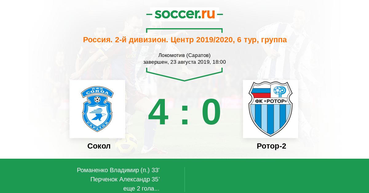 Россия. Вторая лига. Группа 3 20.10.2018 Сокол Логотип футбольный клуб Сокол (Саратов) 4:0 Логотип футбольный клуб Ротор-2 (Волгоград) Ротор-2