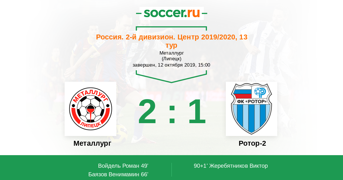 Россия. Вторая лига. Группа 3 06.04.2019 Металлург Логотип футбольный клуб Металлург (Липецк) 3:2 Логотип футбольный клуб Ротор-2 (Волгоград) Ротор-2