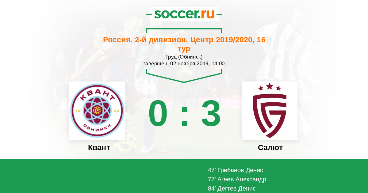 Россия. Вторая лига. Группа 3 19.09.2020 Квант Логотип футбольный клуб Квант (Обнинск) 0:0 Логотип футбольный клуб Салют (Белгород) Салют