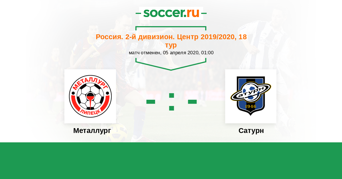 Россия. Вторая лига. Группа 3 20.04.2019 Металлург Логотип футбольный клуб Металлург (Липецк) 0:2 Логотип футбольный клуб Сатурн (Раменское) Сатурн