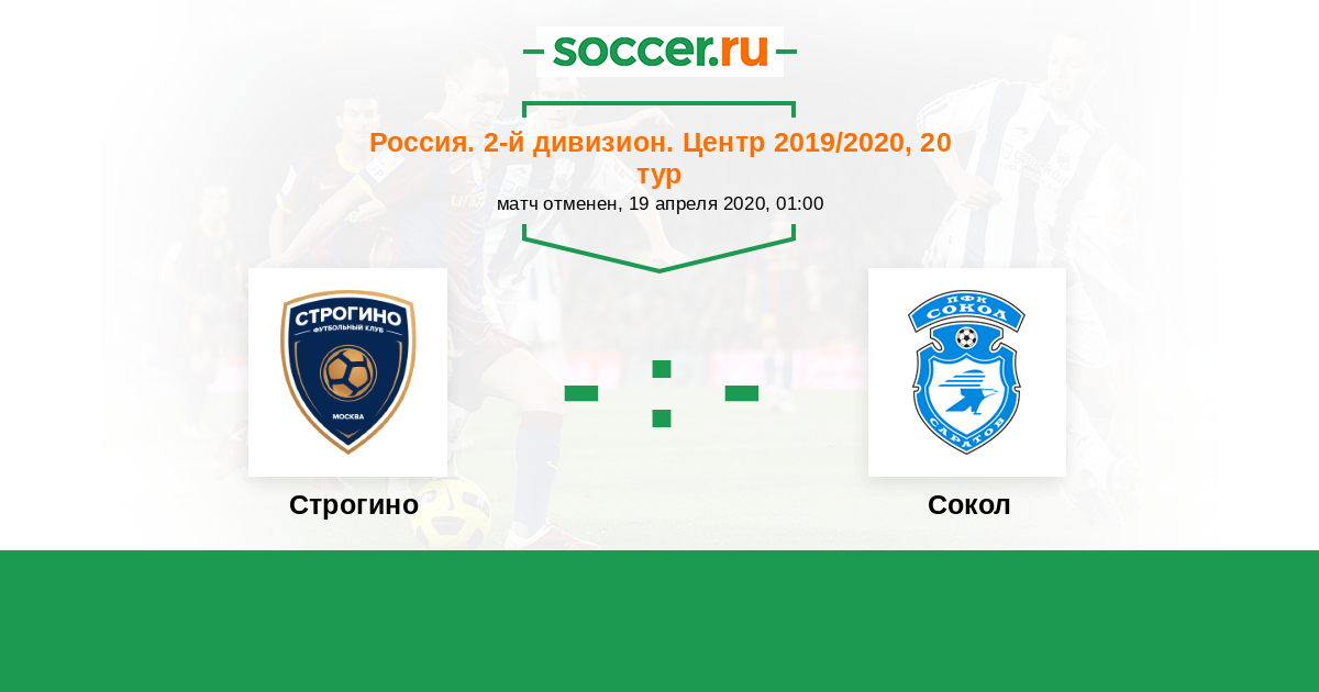 Россия. Вторая лига. Группа 3 06.04.2019 Сокол Логотип футбольный клуб Сокол (Саратов) 3:1 Логотип футбольный клуб Строгино (Москва) Строгино