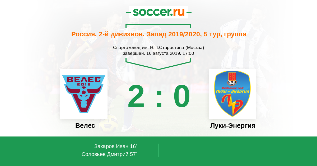 Россия. Вторая лига. Группа 2 03.08.2018 Луки-Энергия Логотип футбольный клуб Луки-Энергия (Великие Луки) 3:0 Логотип футбольный клуб Велес (Москва) Велес