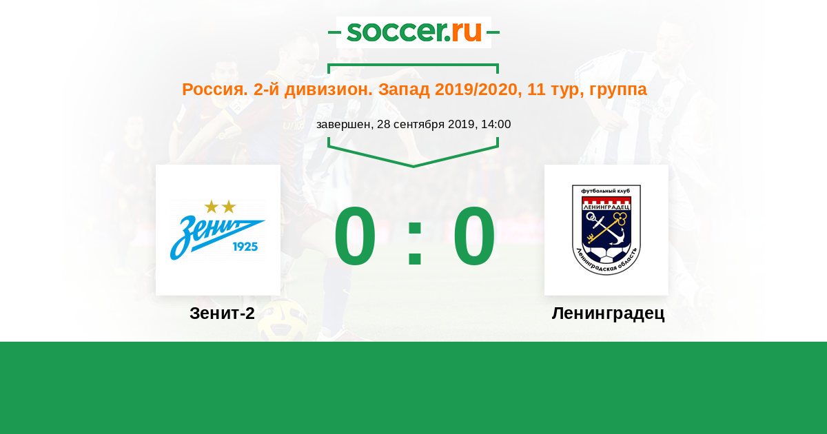 Россия. Вторая лига. Группа 2 10.09.2021 Зенит-2 Логотип футбольный клуб Зенит-2 (Санкт-Петербург) 1:1 Логотип футбольный клуб Ленинградец (Ленинградская обл.) Ленинградец