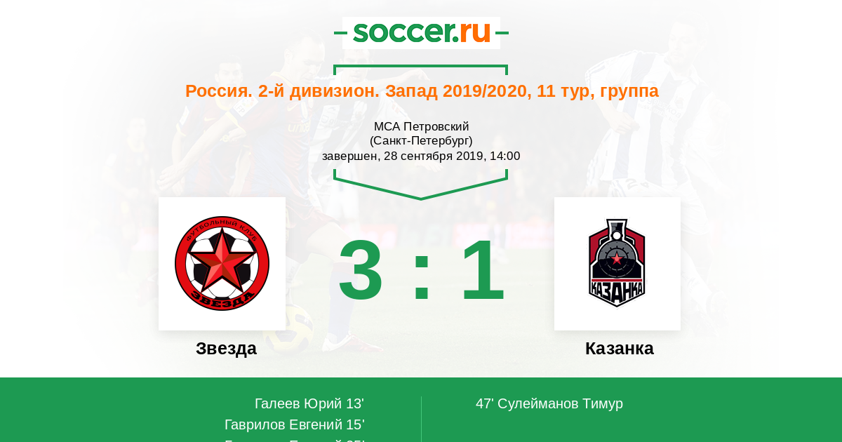 Россия. Вторая лига. Группа 2 12.09.2020 Казанка Логотип футбольный клуб Казанка (Москва) 4:1 Логотип футбольный клуб Звезда (Санкт-Петербург) Звезда