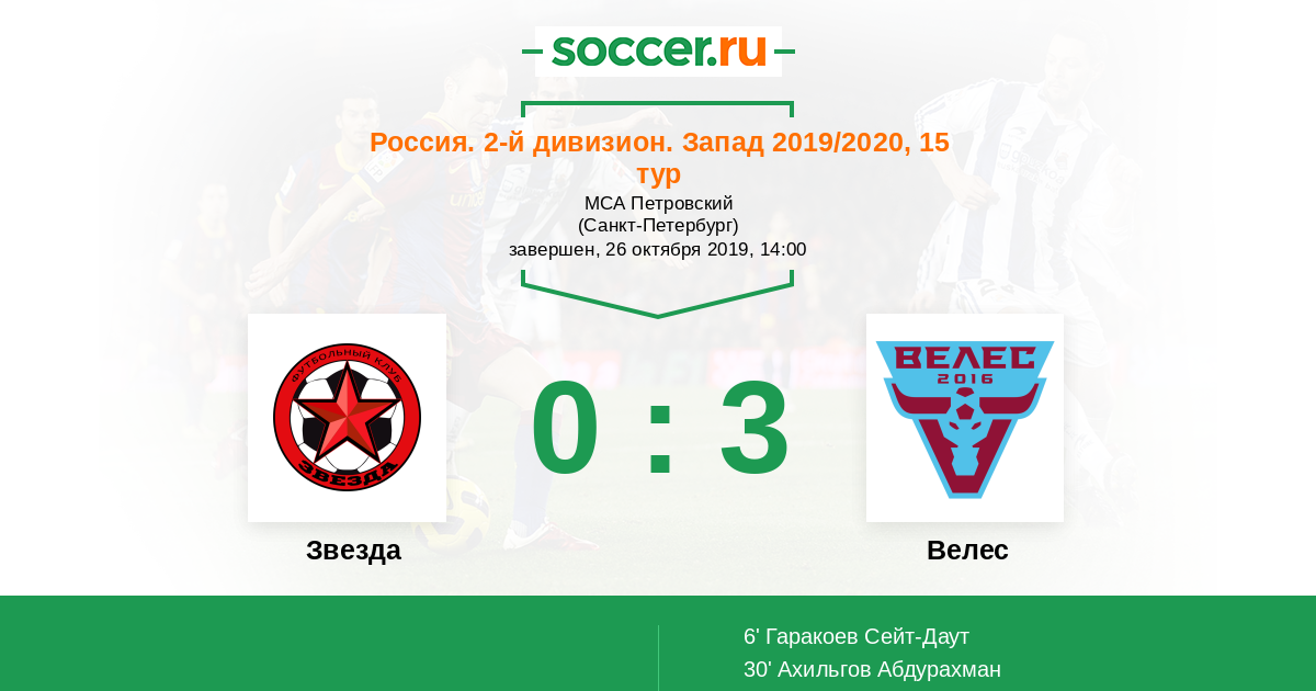 Россия. Вторая лига. Группа 2 01.08.2019 Велес Логотип футбольный клуб Велес (Москва) 3:0 Логотип футбольный клуб Звезда (Санкт-Петербург) Звезда