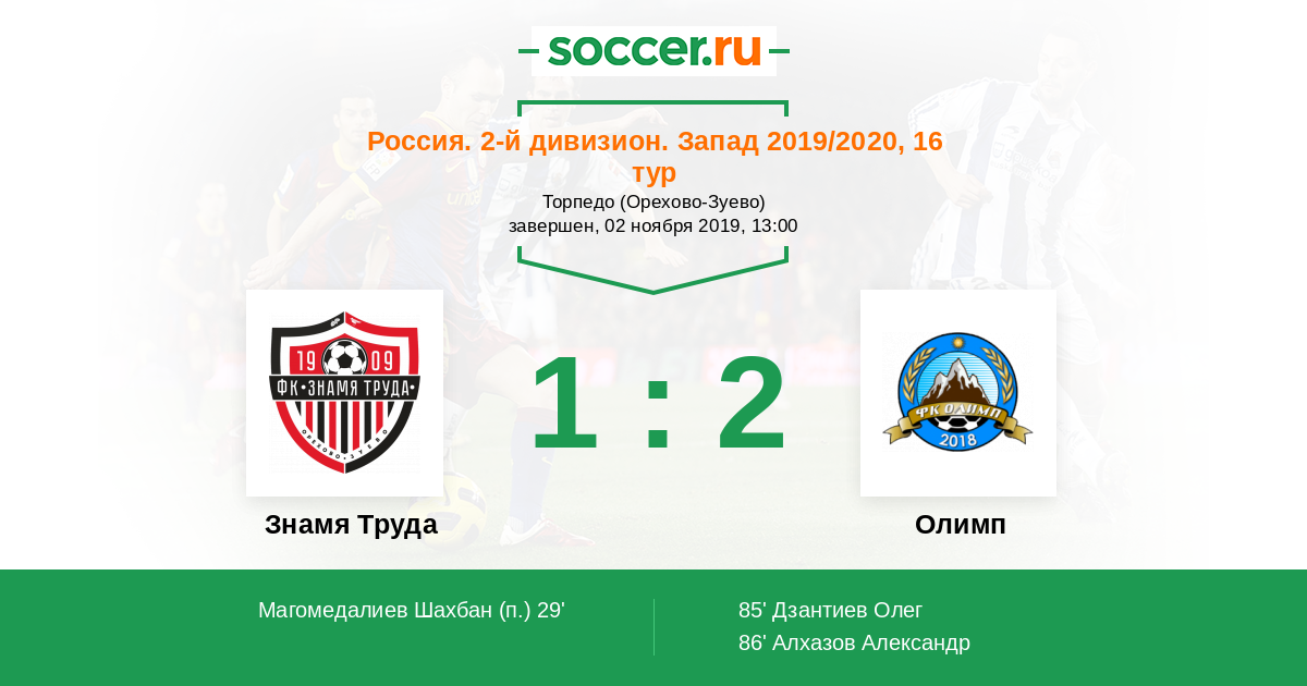 Россия. Вторая лига. Группа 2 02.11.2019 Знамя Труда Логотип футбольный клуб Знамя Труда (Орехово-Зуево) 1:2 Логотип футбольный клуб Олимп (Химки) Олимп