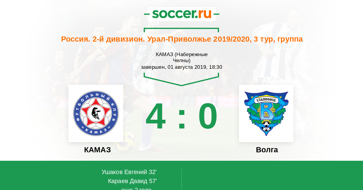 Россия. Вторая лига. Группа 4 12.09.2014 Волга Логотип футбольный клуб Волга (Ульяновск) 0:0 Логотип футбольный клуб КАМАЗ (Набережные Челны) КАМАЗ