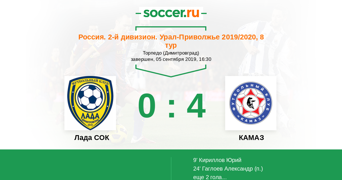 Россия. Вторая лига. Группа 4 29.08.2020 КАМАЗ Логотип футбольный клуб КАМАЗ (Набережные Челны) 4:0 Логотип футбольный клуб Лада СОК (Димитровград) Лада СОК