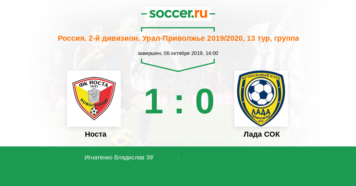 Россия. Вторая лига. Группа 4 01.08.2019 Лада СОК Логотип футбольный клуб Лада СОК (Димитровград) 1:1 Логотип футбольный клуб Носта (Новотроицк) Носта
