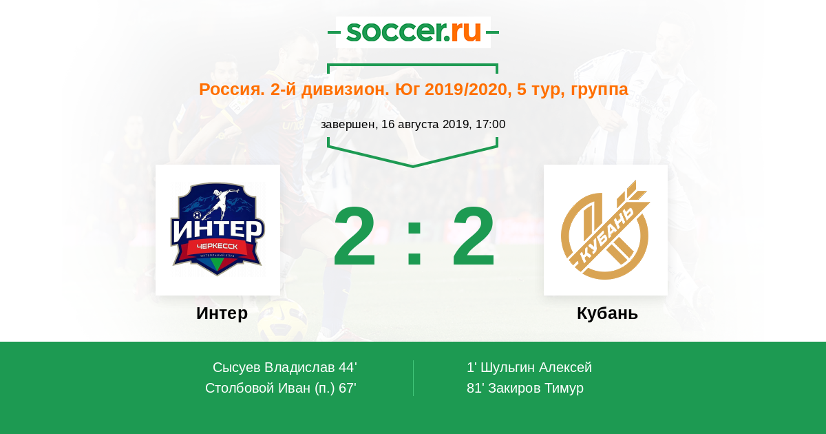 Россия. Вторая лига. Группа 1 09.06.2021 Интер Логотип футбольный клуб Интер (Черкесск) 0:7 Логотип футбольный клуб Кубань (Краснодар) Кубань