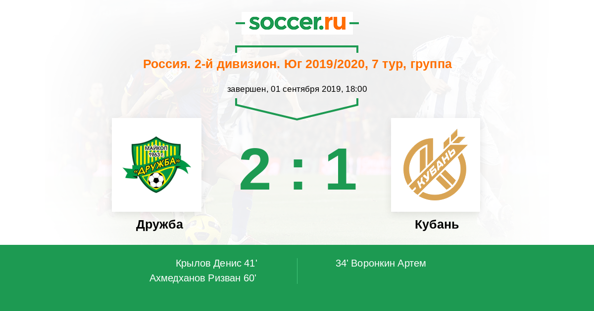 Россия. Вторая лига. Группа 1 29.08.2020 Кубань Логотип футбольный клуб Кубань (Краснодар) 2:0 Логотип футбольный клуб Дружба (Майкоп) Дружба
