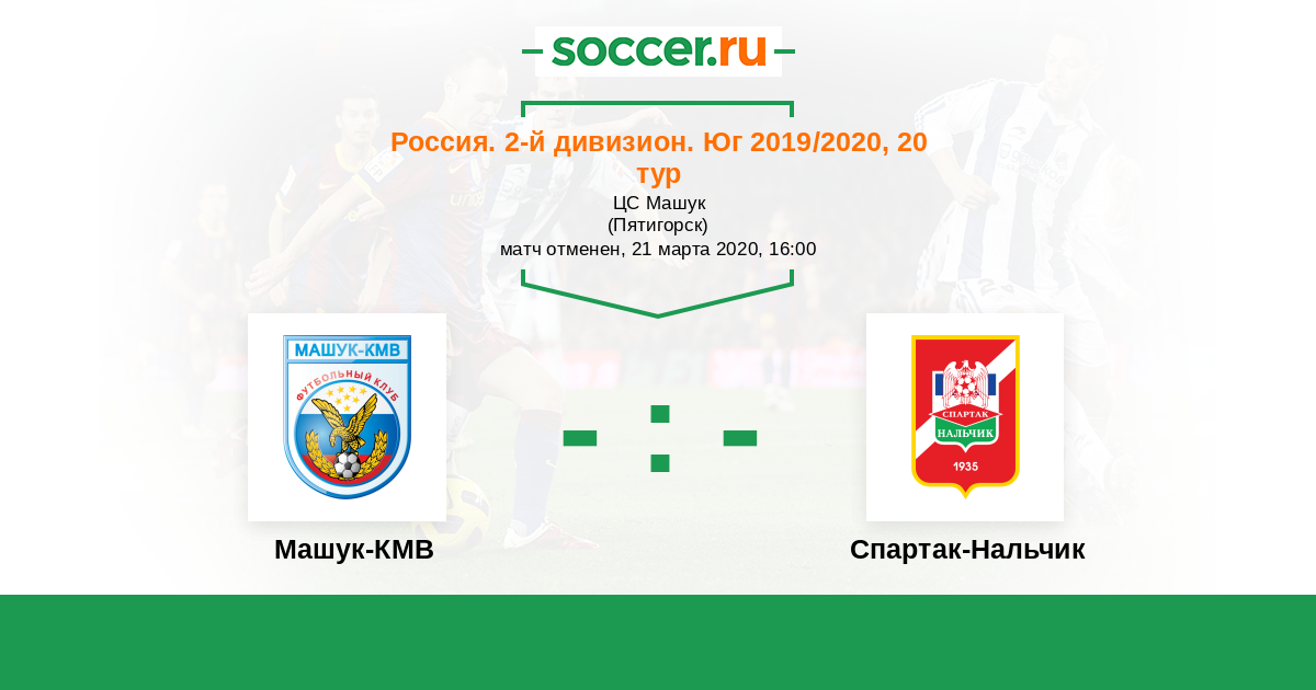 Россия. Вторая лига. Группа 1 24.08.2019 Спартак-Нальчик Логотип футбольный клуб Спартак-Нальчик 0:3 Логотип футбольный клуб Машук-КМВ (Пятигорск) Машук-КМВ