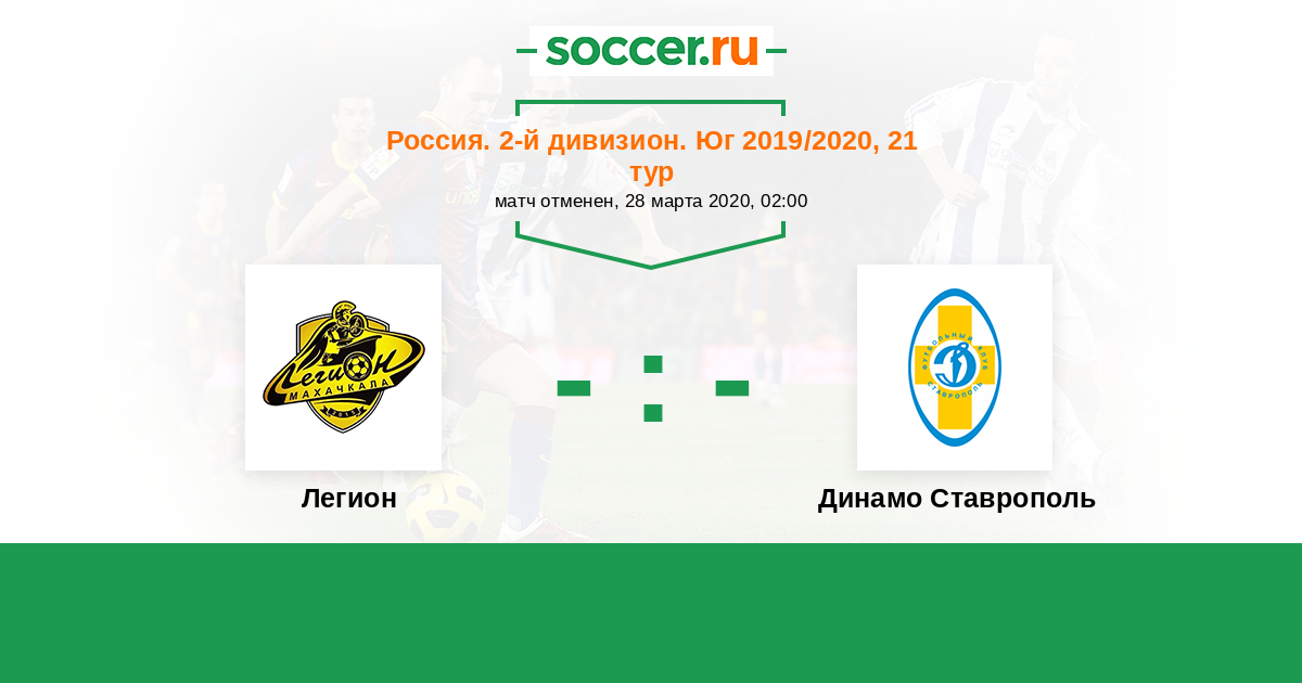 Россия. Вторая лига. Группа 1 24.03.2021 Легион Логотип футбольный клуб Легион (Махачкала) 1:1 Логотип футбольный клуб Динамо Ставрополь Динамо Ставрополь