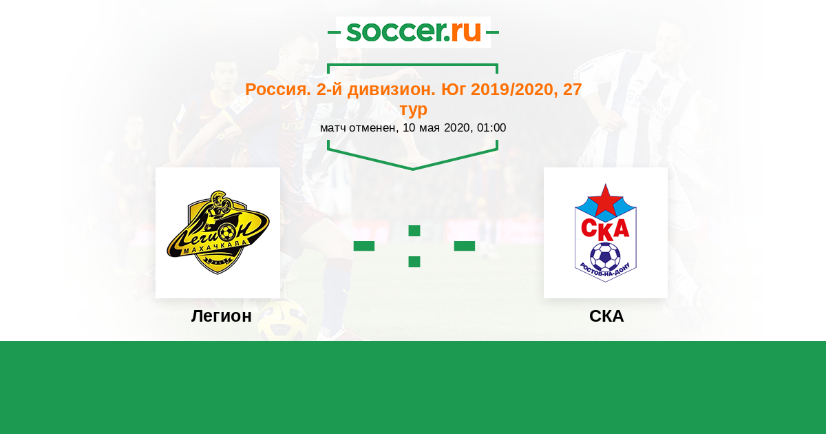 Россия. Вторая лига. Группа 1 10.05.2021 Легион Логотип футбольный клуб Легион (Махачкала) 0:0 Логотип футбольный клуб СКА (Ростов-на-Дону) СКА
