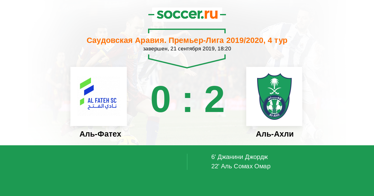 Саудовская Аравия. Премьер-Лига 21.02.2020 Аль-Ахли Логотип футбольный клуб Аль-Ахли (Джидда) 0:1 Логотип футбольный клуб Аль-Фатех (Эль-Хаса) Аль-Фатех