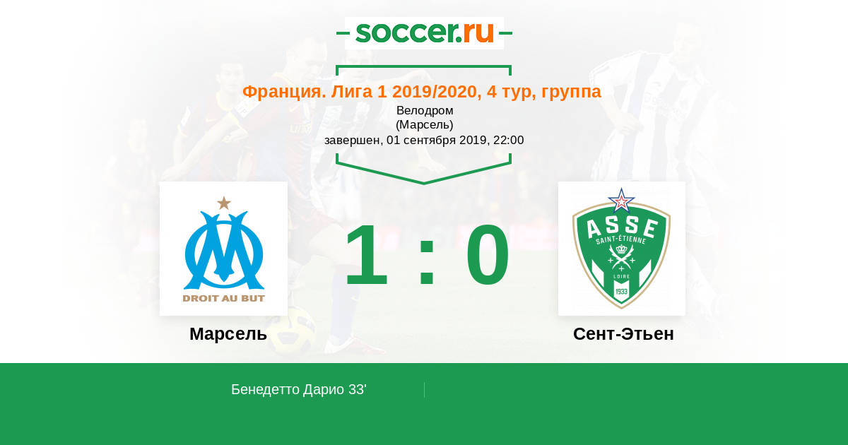 Франция. Лига 1 17.09.2020 Марсель Логотип футбольный клуб Марсель 0:2 Логотип футбольный клуб Сент-Этьен Сент-Этьен