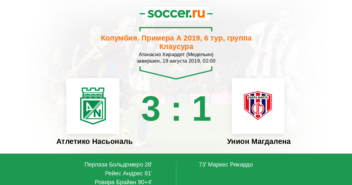 Колумбия. Примера А 24.02.2019 Унион Магдалена Логотип футбольный клуб Унион Магдалена (Санта Марта) 1:0 Логотип футбольный клуб Атлетико Насьональ (Медельин) Атлетико Насьональ