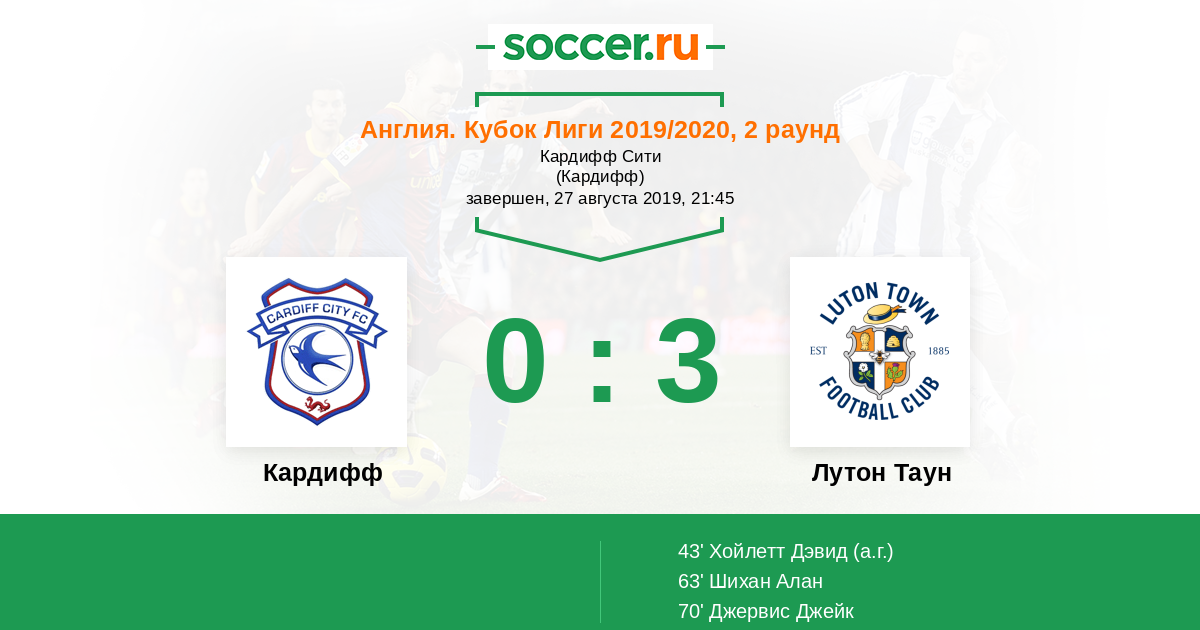 Англия. Чемпионшип 10.08.2019 Кардифф Логотип футбольный клуб Кардифф 2:1 Логотип футбольный клуб Лутон Таун Лутон Таун