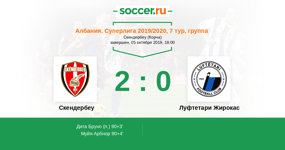Албания. Суперлига 18.12.2019 Луфтетари Жирокас Логотип футбольный клуб Луфтетари Жирокас (Жирокастер) 2:0 Логотип футбольный клуб Скендербеу (Корча) Скендербеу