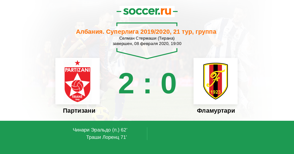 Албания. Суперлига 19.06.2020 Фламуртари Логотип футбольный клуб Фламуртари (Влера) 1:2 Логотип футбольный клуб Партизани (Тирана) Партизани