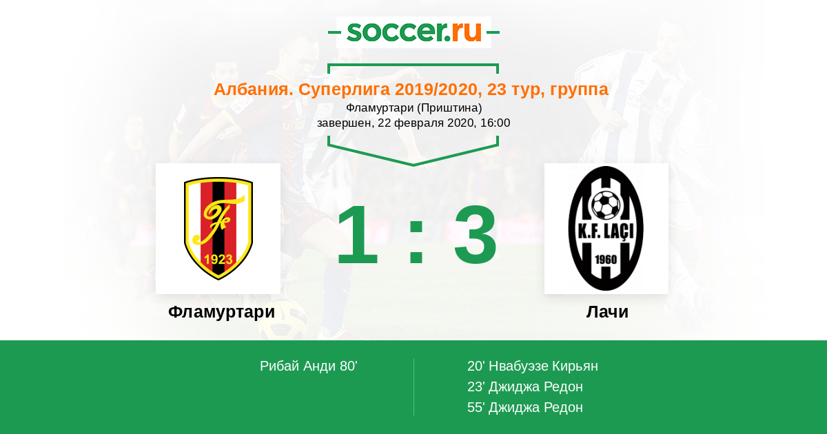 Албания. Суперлига 17.02.2013 Лачи Логотип футбольный клуб Лачи 1:2 Логотип футбольный клуб Фламуртари (Влера) Фламуртари