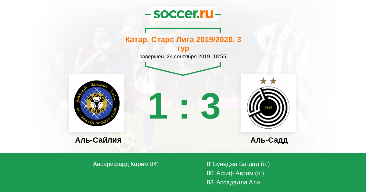 Катар. Старс Лига 22.09.2017 Аль-Сайлия Логотип футбольный клуб Аль-Сайлия (Доха) 2:3 Логотип футбольный клуб Аль-Садд (Доха) Аль-Садд