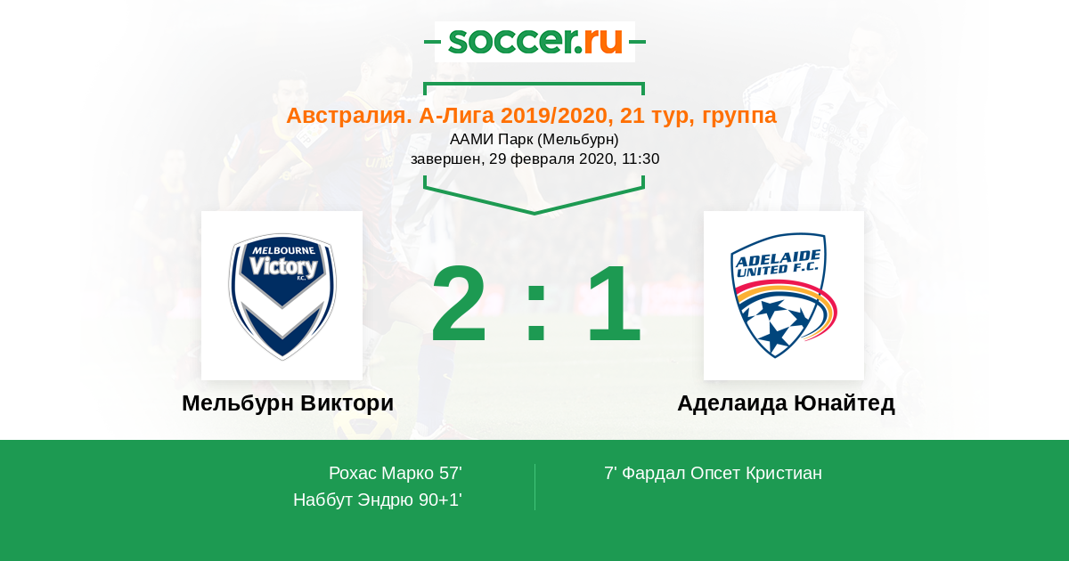 Австралия. А-Лига 09.01.2019 Аделаида Юнайтед Логотип футбольный клуб Аделаида Юнайтед 2:0 Логотип футбольный клуб Мельбурн Виктори Мельбурн Виктори