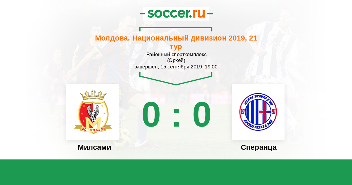Молдова. Национальный дивизион 21.06.2019 Сперанца Логотип футбольный клуб Сперанца (Крихана Веке) 0:1 Логотип футбольный клуб Милсами (Оргеев) Милсами