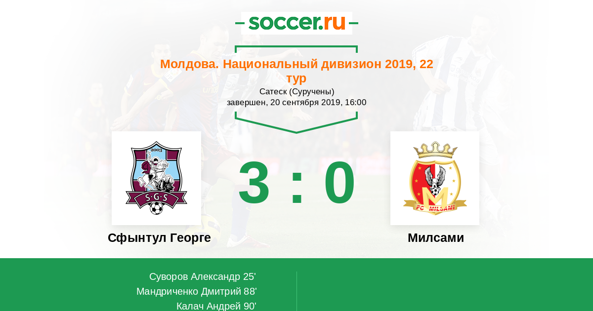 Молдова. Национальный дивизион 20.09.2009 Милсами Логотип футбольный клуб Милсами (Оргеев) 1:0 Логотип футбольный клуб Сфынтул Георге (Суручены) Сфынтул Георге