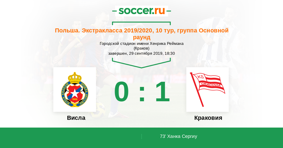 Польша. Экстракласса 07.10.2018 Краковия Логотип футбольный клуб Краковия 0:2 Логотип футбольный клуб Висла (Краков) Висла