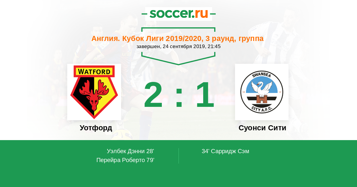 Англия. Премьер-Лига 23.09.2017 Суонси Сити Логотип футбольный клуб Суонси Сити 1:2 Логотип футбольный клуб Уотфорд Уотфорд