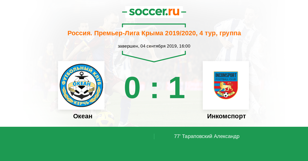 Россия. Премьер-Лига Крыма 04.09.2019 Океан Логотип футбольный клуб Океан (Керчь) 0:1 Логотип футбольный клуб Инкомспорт (Ялта) Инкомспорт
