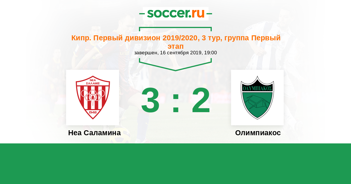Кипр. Первый Дивизион 22.12.2019 Олимпиакос Логотип футбольный клуб Олимпиакос (Никосия) 0:3 Логотип футбольный клуб Неа Саламина (Ларнака) Неа Саламина
