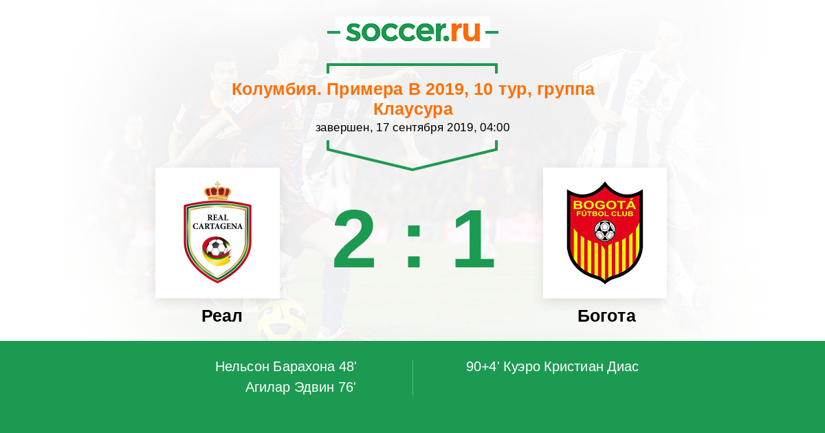 Колумбия. Примера B 22.10.2019 Богота Логотип футбольный клуб Богота 1:1 Логотип футбольный клуб Реал (Картахена) Реал