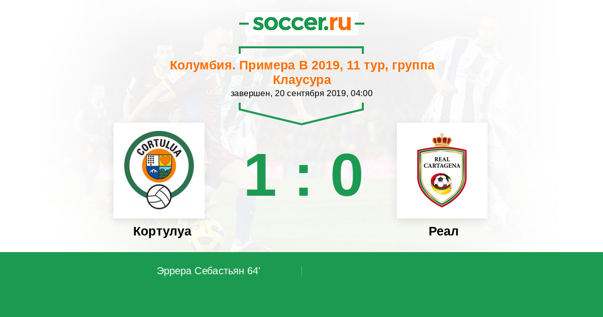 Колумбия. Примера B 20.09.2018 Кортулуа Логотип футбольный клуб Кортулуа 0:2 Логотип футбольный клуб Реал (Картахена) Реал