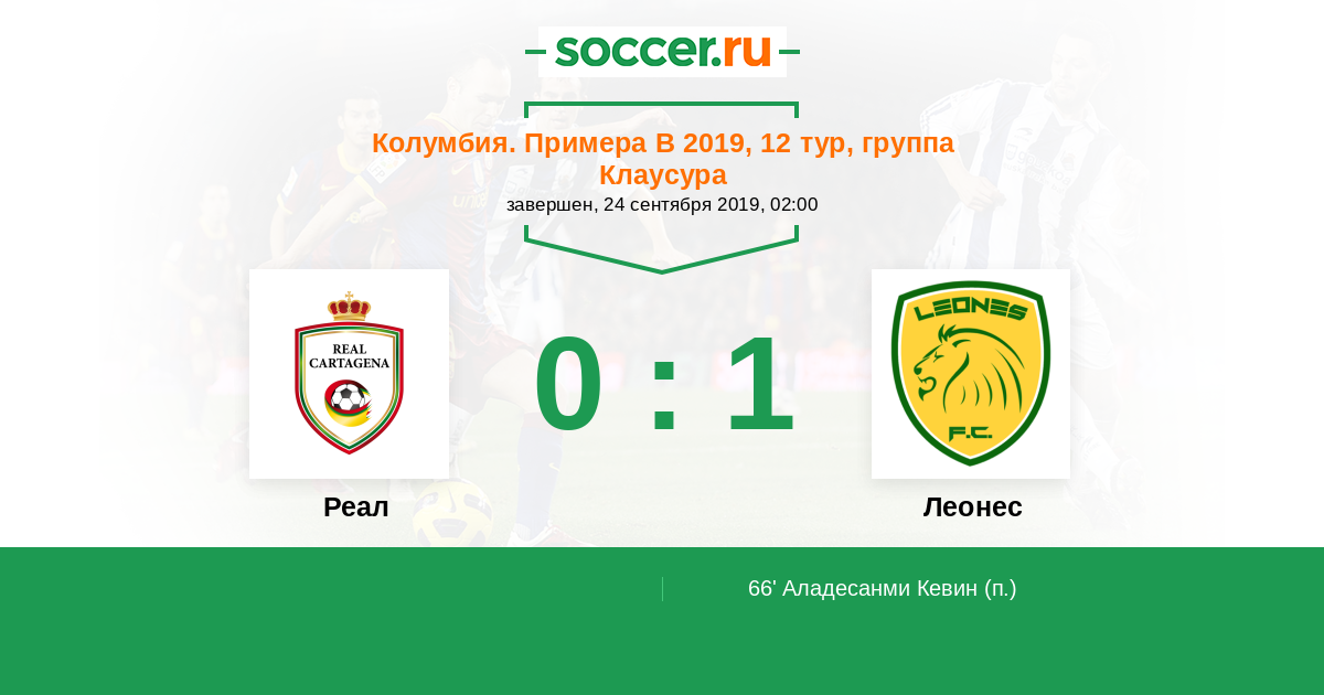 Колумбия. Примера B 19.09.2021 Леонес Логотип футбольный клуб Леонес (Итагуи) 2:0 Логотип футбольный клуб Реал (Картахена) Реал